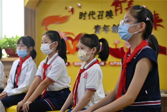 天津市和平区新星小学学生在观看电影《我和我的祖国》(2021年9月28日摄)。新华社记者 李然 摄
