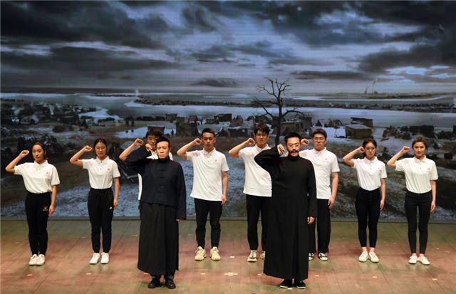 电视剧《觉醒年代》主创团队走进北京大学,剧中主要演员与北大学生同台演出(2021年4月20日摄)。新华社记者 任超 摄