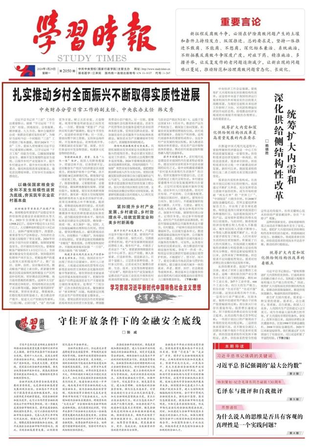 中央财办分管日常工作的副主任、中央农办主任韩文秀在《学习时报》头版头条发表了题为《扎实推动乡村全面振兴不断取得实质性进展》的重磅文章。