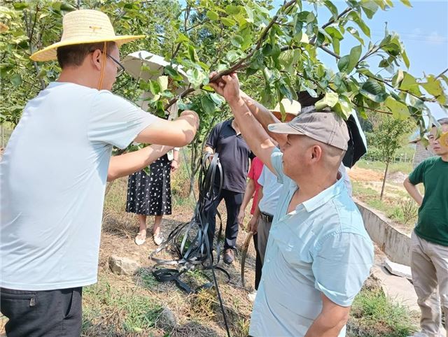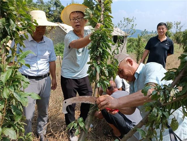 涂军明、丁凤菊、徐丽荣等环保、林业、科普专家,与湖北云盖农业发展有限公司老板柴祖海,在果茶基地现场,传授科普技术,现场辅导指导对翠冠梨、桃形李进行整理、打理、护理,促其果树有序成长,保护好生态环境,实现增产增效,农民增收。