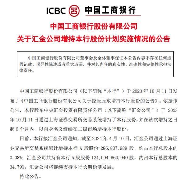 工商银行公告称,截至2024年4月10日,汇金公司通过上海证券交易所交易系统累计增持本行A股股份286,807,989股,约占本行总股本的0.08%;汇金公司共持有本行A股股份124,004,660,940股,约占本行总股本的34.79%。