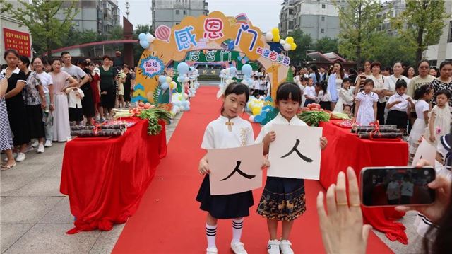 在晨光的照耀下,一年级新生在老师的引领下,满怀期待地穿过“礼仪门”,它寓意着知书达礼,接着穿过了智慧开启的“启智门”,象征着他们正式步入知识的殿堂,开启了人生新阶段的智慧学习之旅,最后穿过“感恩门”,象征着他们要学会知恩感恩,理解父母的养育之恩,师长的教诲之恩,朋友的帮助之恩等。