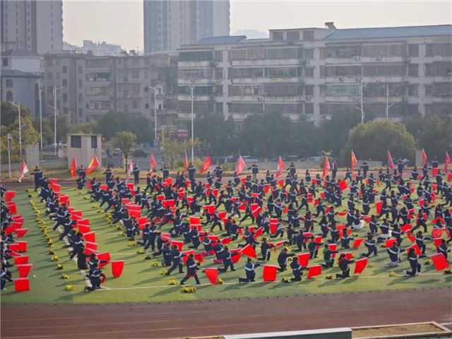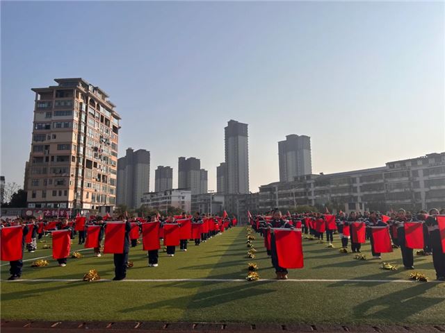 旗帜于同学们手中灵动飞舞,似蛟龙出海,又像彩云追月。 他们身姿矫健,动作协调统一,每一次挥旗都尽显豪迈,诠释团队力量。